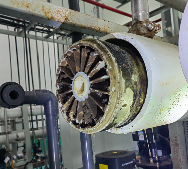由于前段時間中水車間雙膜系統發生嚴重生物污染,反滲透膜長滿了生物菌。